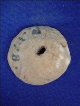 | Description / विवरण | Terracotta wheel, with a flat surface at one side while other side in oval shape. A hole is seen at the centre, probably to fix with the axle. |
