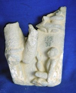 | Description / विवरण | Fragment of a sculpture, depicting a hand of a main figure, palm of which is broken along with all other parts of body. On left of main figure a seated female figure is depicted which is almost rubbed off. Above the seated figure only legs of another seated figure is visible. Rest part of the body is missing. |