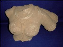 | Description / विवरण | Fragment of a sculpture depicting only the chest and left arm of a female figurine. The figurine is wearing necklace, garland and armlet and she has voluptuous breast. |