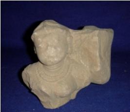 | Description / विवरण | Fragment of a sculpture of a female bust. She is wearing a beautiful head gear and adorned with jewels like earrings and necklaces. Her hands are missing and right breast is rubbed out. |