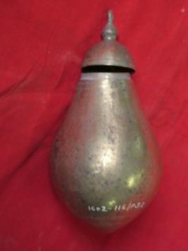 | Description / विवरण | It is a water vessel in gourd shape with a lid attached to it. It has a flat surface with some circular lines engraved on the top. |