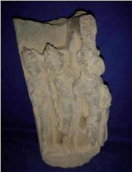 | Description / विवरण | Fragment of a sculpture depicting two standing male figurines and one standing female figurine in between them, in high relief. The figurine of main deity is missing. At the extreme right one male figurine is seen holding srifal in his right hand and a lough with his left hand. Next to him a standing female figurine is seen, holding her tussles with her right hand and a lotus with stem with her left hand. Next to her one male figurine is seen, right arm of which is missing from elbow and holding a shankha with his left hand. His leg from ankle is broken and face is chopped off. |