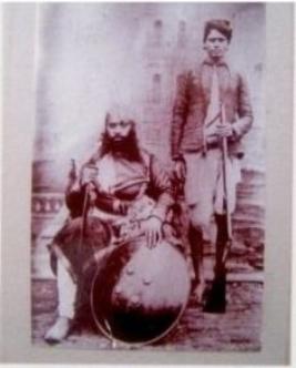 | Description / विवरण | This is the photograph of Thakur Jowahir Singh of Kheri. In this photograph two persons are visible one is sitting another is standing beside him the sitting person is having sword and shield. The standing person is having a gun. |