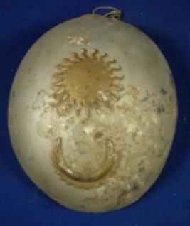 | Description / विवरण | Oval shaped iron helmet painted with silver colour on the exterior and has embossed seen and moon design. The inner side is plain. |