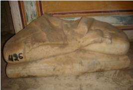 | Description / विवरण | Fragment of a sculpture depicting a seated figure of Jaina Tirathankara in Padmasana, but only legs are visible and upper portion is chopped off. On the pedestal, four lines are inscribed in Devanagari script. |