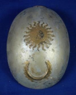 | Description / विवरण | Oval shaped iron helmet painted with silver colour on the exterior and has embossed seen and moon design. The inner side is plain. |