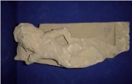 | Description / विवरण | Fragment of sculpture depicting a male figurine probably Brahma in standing position. The legs and the right hand from elbow is missing. The left hand is also chopped off. The figurine has elaborate head gear and bearded face. He wearing jewels like armlets, kundala and sacred thread. |