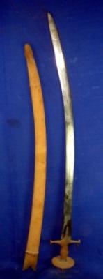 | Description / विवरण | Iron Sword with curved blade and a simple Alamgiri hilt. The Scabbard has the metallic chaunthi and made of wood that covered by cotton. |