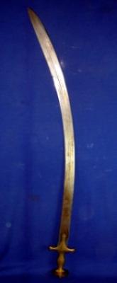 | Description / विवरण | Sword with three long grooves in the each side of the blade and a Alamgiri hilt with golden koft work. The scabbard is made of velvet and covered by velvet in blue and red colour combination. There is a metallic chaunthi without any decoration. |