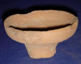 | Description / विवरण | Pedestal lamp with a transverse perforation at the base which was probably to put several in a row. Its rim is partially flaked off. |