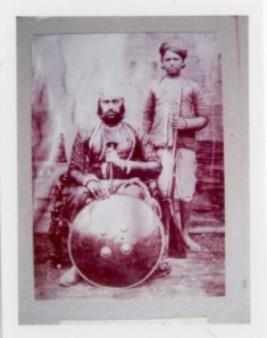 | Description / विवरण | This is the photograph of Thakur Mangal Singh. Who is sitting on a chair with shield and sword beside him a person is standing with a gun. Both are in well dress with turbans. |