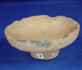 | Description / विवरण | Coarse, earthen pedestaled lamp with transverse perforation at the base probably to put the lamp in a row. The rim is partially flaked off. |
