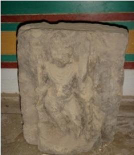 | Description / विवरण | Fragment of an independent sculpture depicting Dhanush purush. He is holding something with right hand which is mutilated, with left hand holding a bow. He is adorned with head gear, necklaces, garland and transparent drapery. The whole figurine is worn out. |