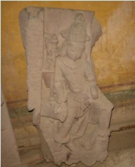 | Description / विवरण | Fragment of an independent sculpture depicting a digpala, four armed vayu in standing position. Attributes from below i. Varada mudra. II. Holding a mace. III. Missing IV. Missing. He is adorned with ornamented head gear, round earrings, necklace, sacred thread, bangles, armlets and anklets. He is wearing transparent drapery. A vanmala is also visible. |