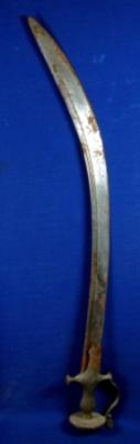 | Description / विवरण | Iron tegha Sword having curved blade with two nails grooves and todedar with knuckle guard hilt with ridges. The blade is rusting. |