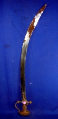 | Description / विवरण | Iron tegha sword with slightly curved blade and simple Alamgiri hilt with knuckle guard. It is slightly rusted. |