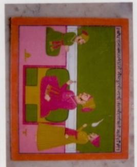 | Description / विवरण | Bakhat Singh is sitting holding flower in his right hand. Sardar is sitting in front side of him and a assistants are standing behind him. Attendants are wearing yellow and green jama |