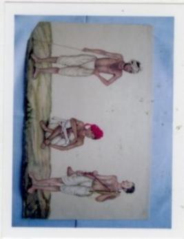 | Description / विवरण | The painting depicts three jat, two are standing while third one is sitting on the ground in the middle. All are wearing white dhoti & two are wearing white & red turban one is standing with the help of stick & other is smoking hukka. |