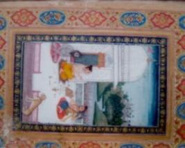 | Description / विवरण | A Hermit is sitting in front of temple. One lady is playing music and one man playing sitar music. The temple is white and color used are red, yellow and bluish. A dog is visible in the foreground tied with rope. In the background river, hills and some architecture is visible |