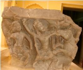 | Description / विवरण | Fragment of an independent sculpture depicting scenes of child hood of Krishna- Kesi Nisudam. He is depicted fighting with two rams. One ram has screwed his left arm with its teeth and Krishna has raised his right arm upwards. Another ram is depicted beneath Krishna. His legs are missing. On the right of him, another gopa is depicted whose right arm and both legs are missing. |