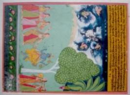 | Description / विवरण | Radha - Krishna are dancing under a tree, five friends playing a song. Some celetial bodies are visible. Pond is full of lotus flowers |
