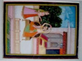 | Description / विवरण | Queen is sitting on a throne keeping both hands upper side. One lady servant is standing behind her. White palace seen and beautiful garden behind of her. She is wearing a yellow blouse and red lower. |