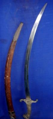 | Description / विवरण | Iron Kirch Sword having slightly curved blade and brass hilt in shape of lion head. The scabbard is of wooden with metal chaunthi. |