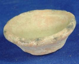 | Description / विवरण | Coarse, terracotta lamp with flat and round base and shallow depression in the middle. Clay incrustation all over. |