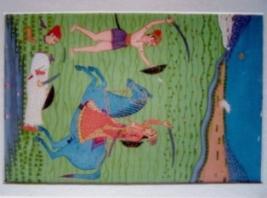 | Description / विवरण | One lady is fighting on a horse and fighting to another lady. A person lying dead below, wearing a red clothes. One parrot, one bird and one rabbit below. Green in ground color. |
