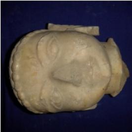 | Description / विवरण | Fragment of an independent sculpture depicting the head of a Jain Tirathankara having curly hair. The Ushnish is chopped off and face is mutilated. The right ear is missing and the left ear is partly mutilated. The figurine has open eyes. |