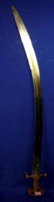 | Description / विवरण | Iron Tegha with slightly curved blade and an long grooves in the both sided of the blade and a Alamgiri hilt without any decoration. |