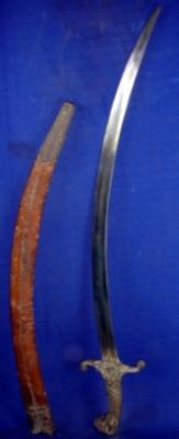 | Description / विवरण | Iron Kirch Sword having slightly curved blade and brass hilt in shape of lion head. The scabbard is of wooden with metal chaunthi. |