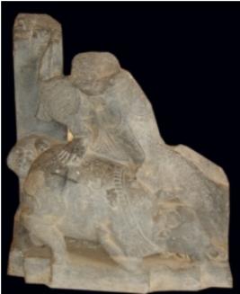 | Description / विवरण | Fragment of an independent sculpture of a Mahishasur Mardini, her upper portion of the body and left leg are chopped off, her right foot is on the buffalo whose head is shown with a cut. Her vahana lion is also seen below her foot and is attacking the buffalo. |