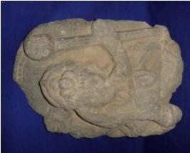 | Description / विवरण | Fragment of an independent sculpture of four armed Chamunda in relief whose face is mutilated. Her attributes from right below 1. holding kharga, 2. probably holding a damru, 3. holding khat bhang, 4. missing. The lower part from stomach is missing. She is adorned with a Jata mukuta with a skull attached and a snake necklace. Her ribs are also visible. |