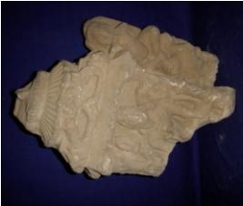 | Description / विवरण | Fragment of an independent sculpture of Lord Shiva, in seated pose, carved in a pillared niche. The face is completely rubbed off. He is holding a trident in right hand and a snake in left hand. The lower right part is broken. On left of the sculpture a male Shivgana is depicted seated on head of a crocodile. |