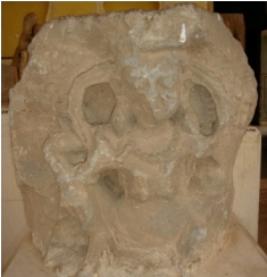 | Description / विवरण | Fragment of an independent sculpture of mother goddess probably Jyestha . She is depicted in seated pose, face and her attributes are totally rubbed off. The only attributes which is seen that, she is pot bellied . A pearl garland is seen in her neck. The body is also rubbed off. |