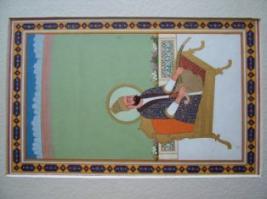 | Description / विवरण | shah Jaha emperor is sitting on a grand weaning a reddish cloth and pinking colour turban in this head coloured usedare lish blue and red. |