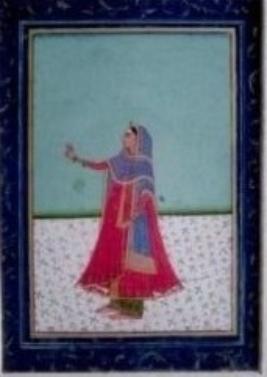 | Description / विवरण | The painting depicts a young girl in standing posture with lifted hand, wearing the red colour tunic, green colour pyjama & blue colour veil. The border of the cloth is decorated in golden colour. She is standing on a white colour carpet having square flacks with green colour outlining. The background is green. |