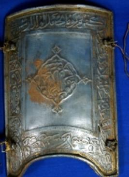 | Description / विवरण | Aina chest plate made of Faulad and having embossed Arabic inscription. The borders have koft work which is almost completely rubbed out. |