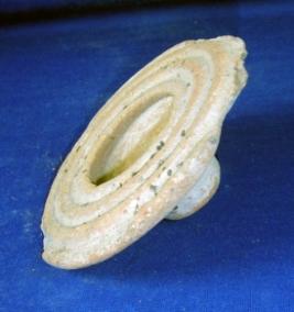 | Description / विवरण | Terracotta lid, ill fired, with a flat circular knob, flared body and circular flat base with concentric circles and deep depression at centre. |