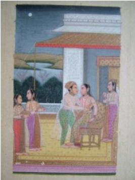 | Description / विवरण | The painting depicts the young man & lady. The young man is standing and trying to make a lady stand from the chair. There are three ladies attendants, one in back & two in front in standing posture. All are present in a chaukhat of the palace. In the background, there are trees, a river, mountains & sky with full moon. |