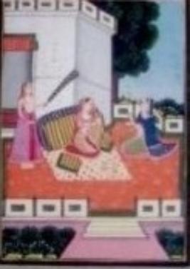 | Description / विवरण | The painting depicts the queen, wearing golden colour decorated long skirt ghagra, pink colour blouse & magenta colour veil, necklace, bangles, sitting on a decorated carpet is hearing the songs. In front of her, a lady is singing & one attendant is standing behind her having chauri in her hand. In the foreground, there is a wooden frame, trees & background contains parts of the palace, trees, sky. It has various colours border. |