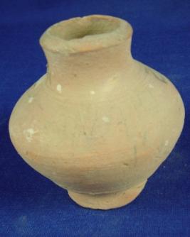 | Description / विवरण | Semi fine, well fired terracotta Miniature pot with high circular-flat base, bulbous body, high neck, narrow mouth with inverted rim, which is slightly flaked off. |
