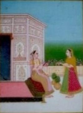 | Description / विवरण | The painting depicts the queen wearing golden coloured decorated ghagra yellow colour blouse & violet colour veil, necklace having white beads, sitting on a cushioned platform in front of the palace holding two long flowers in her hand. A lady attendant with flower s garland is standing in front of her. In the background, there are sky, river, flowers. It has a yellow & blue colour border. |