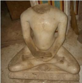 | Description / विवरण | Fragment sculpture of a Jain Tirathankara sitting on a floral designed marble pedestal in Dhyanamudra. The Srivatsa symbol is clearly visible but head is missing. There is an inscription in two lines on the pedestal in Devanagari script. On the centre of the pedestal there is the depiction of full bloomed lotus. |