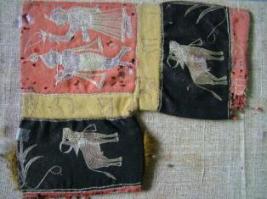 | Description / विवरण | Gaomukhi - It is a L shaped bag made of wool with silk thread embroidery depicting Krishna playing flute and Radha on a peach coloured ground. Above and below the depiction of cows, hindi words have been emboridered. |