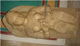 | Description / विवरण | Independent sculpture of a female musician, playing manjeera. Tussles of her drapery is seen up to knee. She is adorned with jewels like earrings, necklace, bangles, armlets etc. Portion below knee is broken. She has a decorated head gear. There is a serpent hood over her head. |