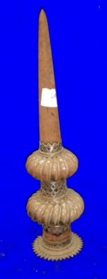 | Description / विवरण | Budi made of iron having hollow mouth to attach the spear and pointed end. Two rings and jali designs are made on it. |