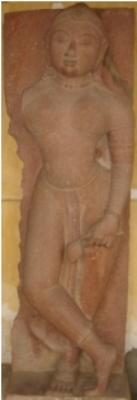 | Description / विवरण | Independent sculpture of a dwarpalika standing with crossed legs, her right hand is missing and only a hole is there to fix it with door jamb. She is holding a lotus in her left hand. she is wearing a blouse and a long transparent drapery. She is adorned with an elaborates hair ornament, round earrings, bangles and anklets. |