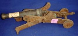 | Description / विवरण | Small canon made of brass kept on a four wheeled one wheel is missing iron cart. The cart is rusted. |